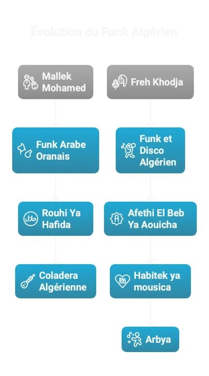 Cette période de transformations musicales a donné naissance à des figures emblématiques du funk algérien, notamment Ahmed Malek, le compositeur visionnaire surnommé l’« Ennio Morricone algérien », Zohra (Dihya), pionnière du disco chaoui, Majid Soula, figure majeure du funk amazigh, et d’autres artistes moins connus mais tout aussi influents qui ont marqué le paysage culturel algérien de cette époque transformatrice.