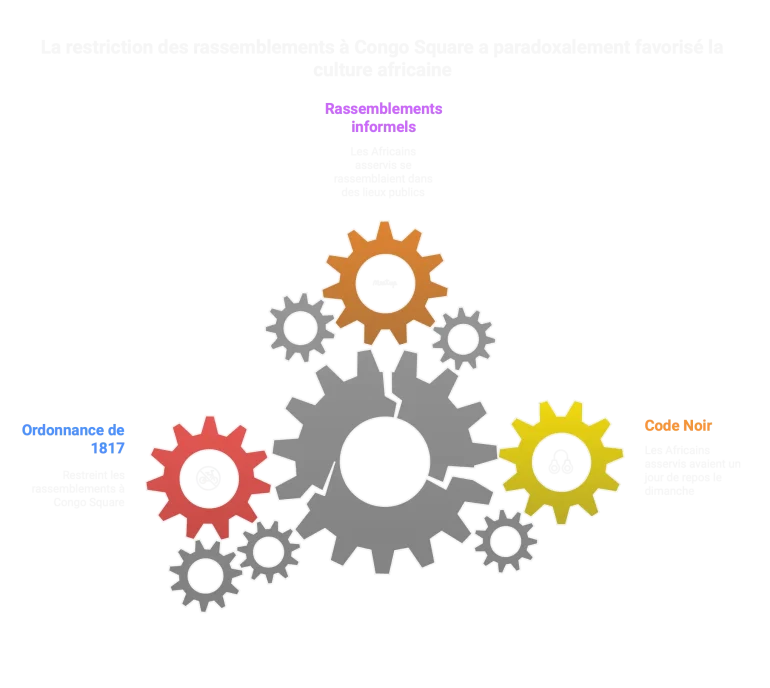 Ce n’est que jusqu’en 1817 que le maire de La Nouvelle-Orléans promulgua une ordonnance municipale qui restreignit tous les rassemblements d’Africains asservis à un unique emplacement : Congo Square.
