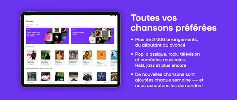 Large bibliothèque de chansons populaires de divers styles (pop, rock, classique, jazz, R&B) et niveaux (débutant à avancé).